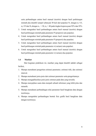 Estimasi parameter adalah proses memperkirakan nilai parameter dari suatu populasi berdasarkan sampel data yang diambil dari populasi tersebut. Parameter adalah karakteristik dari suatu populasi, sedangkan sampel adalah kumpulan data yang diambil dari populasi.